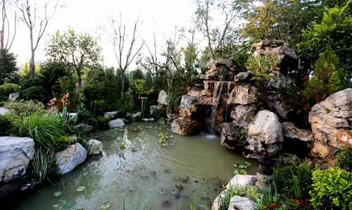 海綿城市是指城市能夠像海綿一樣,在適應(yīng)環(huán)境變化和應(yīng)對自然災(zāi)害等方面具有良好的“彈性”,下雨時吸水、蓄水、滲水、凈水,需要時將蓄存的水釋放并加以利用。展園內(nèi)采用碎石鋪就的“茶馬古道”,既能有限地補(bǔ)充地下水,又有一定的地表徑流削減作用。另外,園內(nèi)水池邊設(shè)置植被緩沖帶,通過植物攔截及土壤下滲作用有效減緩地表徑流流速,并去除徑流中的部分污染物,體現(xiàn)了海綿城市理念的截污凈化功能。