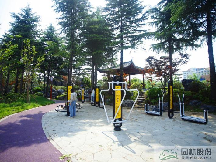 林蔭跑道寬 1.5-2m,地面鋪彩色瀝青,地面為 1200*300*50 厚荔枝面芝麻灰花崗巖地雕,填充部分為字體陰刻 3mm二十四節氣及七十二候;為傳播中華傳統文化,以二十四節氣展開名帖、拓印、詩歌等形式的宣傳,打造新時代文化客廳,讓市民更直觀的感受古典文化魅力。對健身場地道路進行石材鋪裝,安裝健身器材;休憩空間進行石材鋪裝,安裝座椅,方便市民休息,打造集休閑游憩、文化體驗于一體的綠色活動空間。